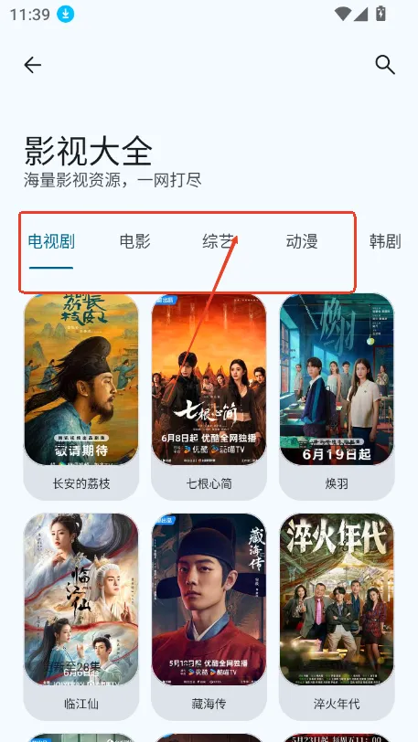 例如进入“影视大全”界面,提供大量影视内容,可以根据分类进行筛选