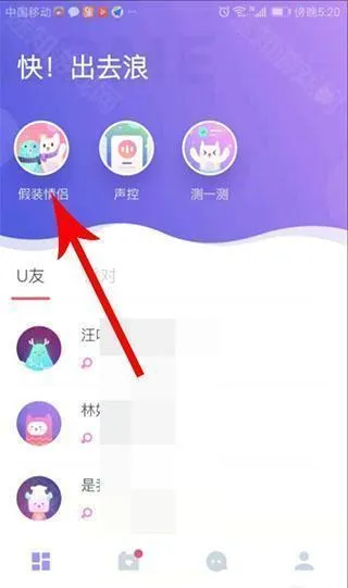 1、来到uki app主页面后,点击左上角的"假装情侣"。