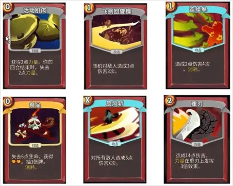 1、力量战:依靠力量卡和多段攻击造成高伤害,进攻强但防御弱。活动肌肉(强化+4力量)是核心白卡。回旋镖(随机4伤)和连续拳(定向5伤)增强前期输出。祭品(能量+过牌)必拿。旋风斩(强力AOE)和重刃(5倍力量)是主力输出。突破极限(强化不消耗)可叠力量。燃烧(前期加力量)别拿太多。恶魔形态(耗能高)慎拿。双重打击(普通两段)可选。观察弱点(易卡手)酌情拿。双发(强化双攻)提升输出。