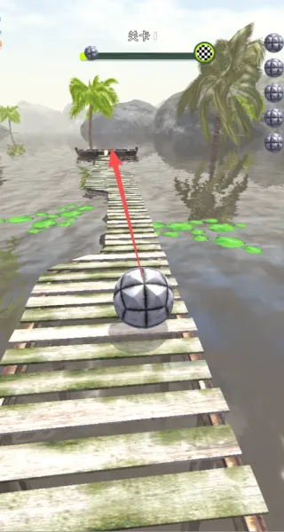 2.紧盯终点方向沿着木桥的延伸路径,保持铁球的直线前进趋势,遇到桥身狭窄处时,减小滑动幅度精准控制铁球平衡避免因偏移掉落水中。
