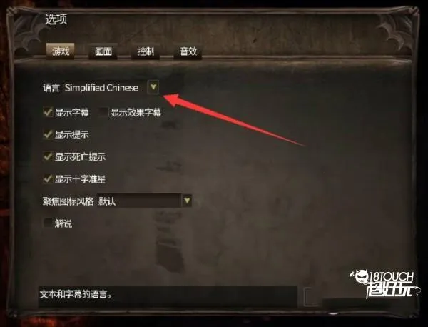 2、在选项中的第一页“游戏”页面中,找到语言,通过下拉菜单选择为simplified chinese(简体中文)即可成功设置。