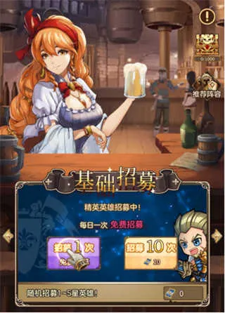 玩家创角成功进入游戏后需要根据系统的要求完成新手任务,过程中玩家可以在酒馆-高级招募进行一次招募,该招募必出一个5星英雄,前期尽可能优先培养该英雄,该英雄培养起来后前期的关卡基本能通关。